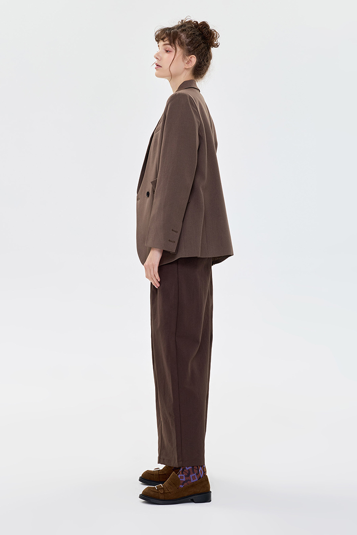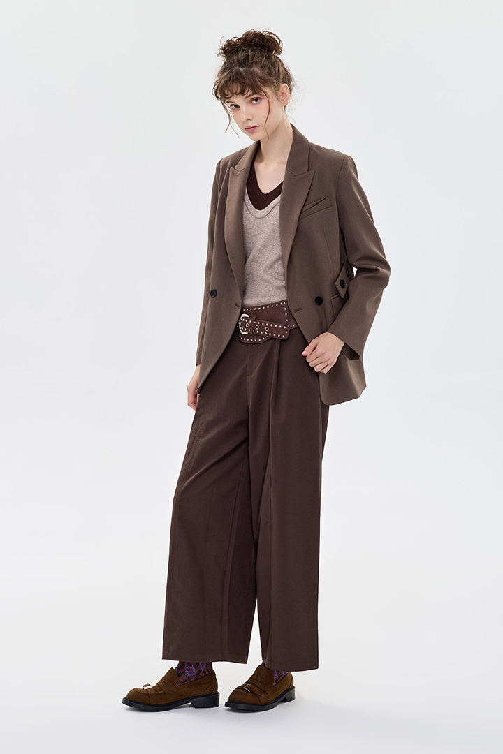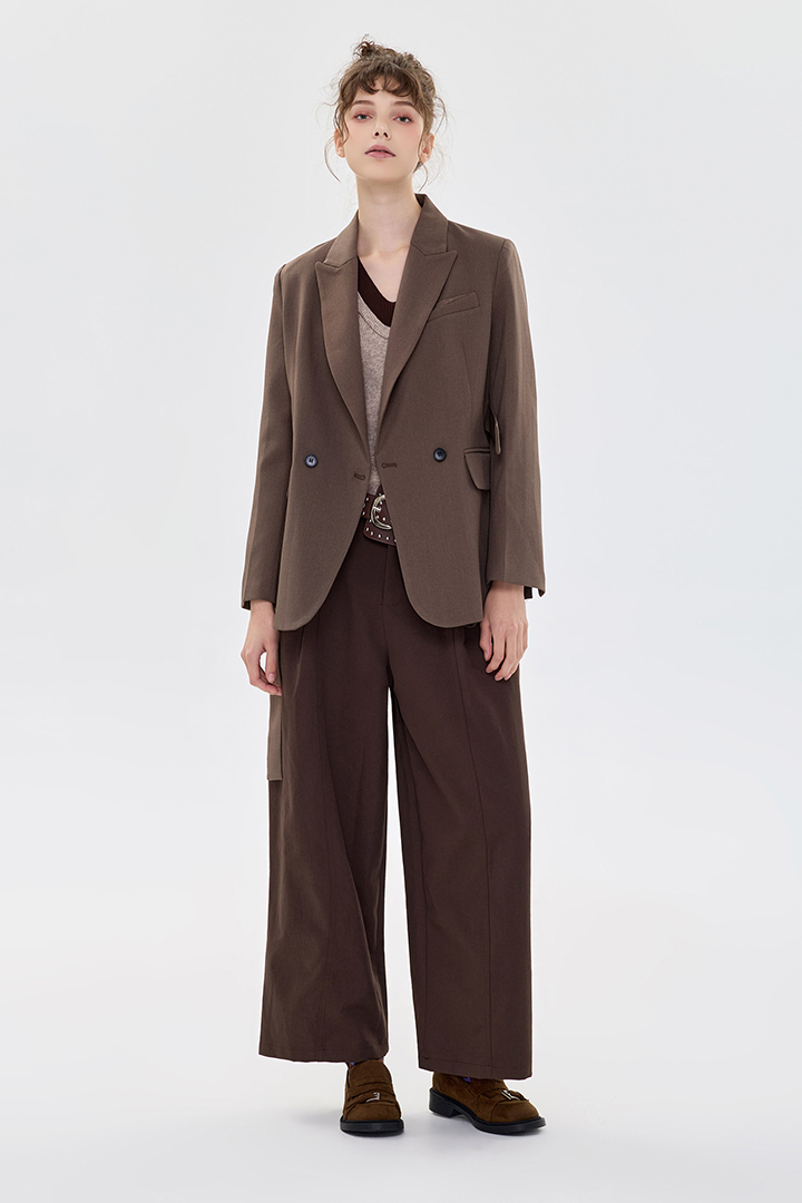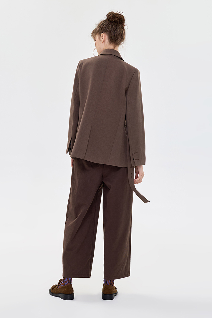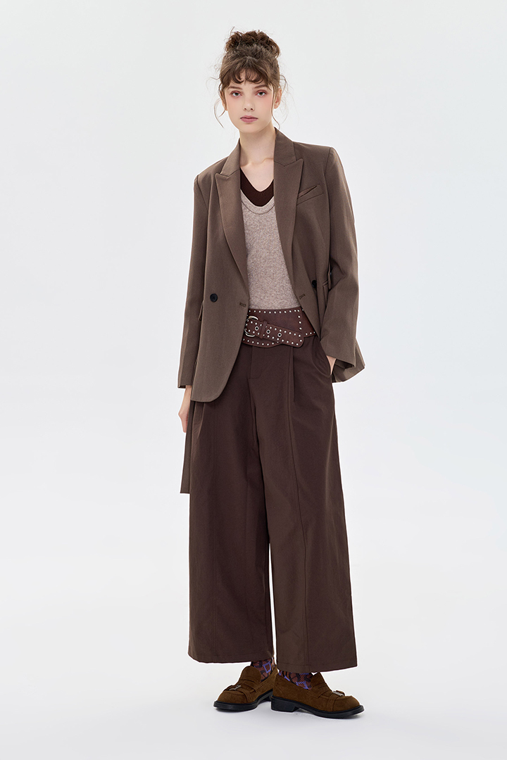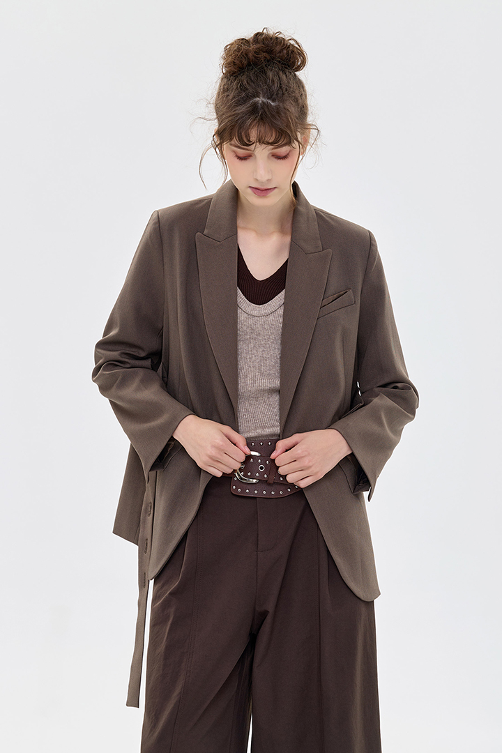 腰帶強化腰線,西裝版型挺括,結構俐落修飾比例。