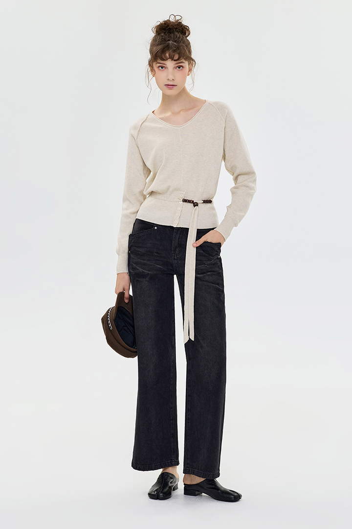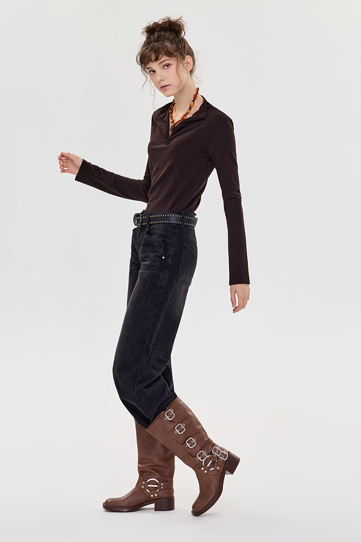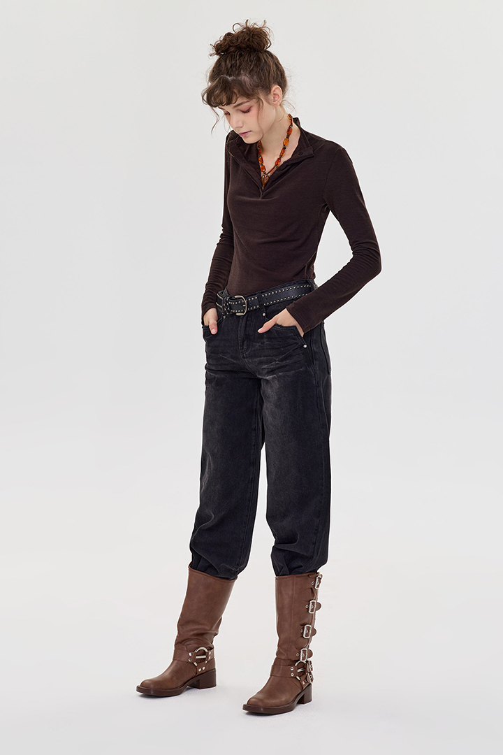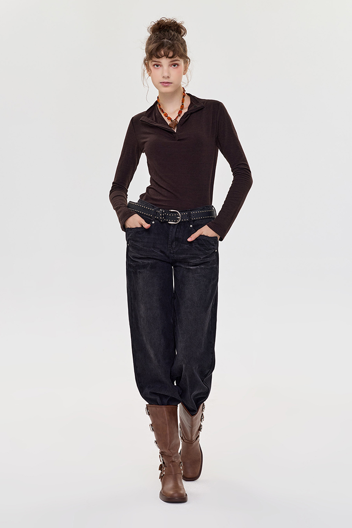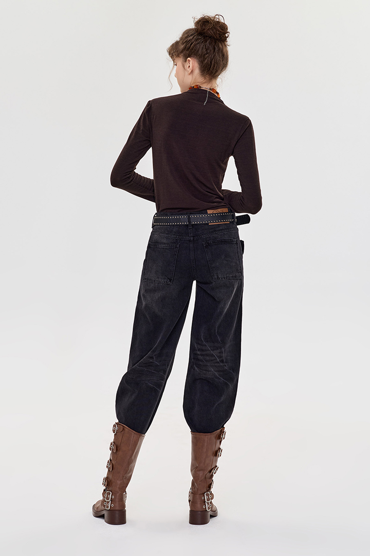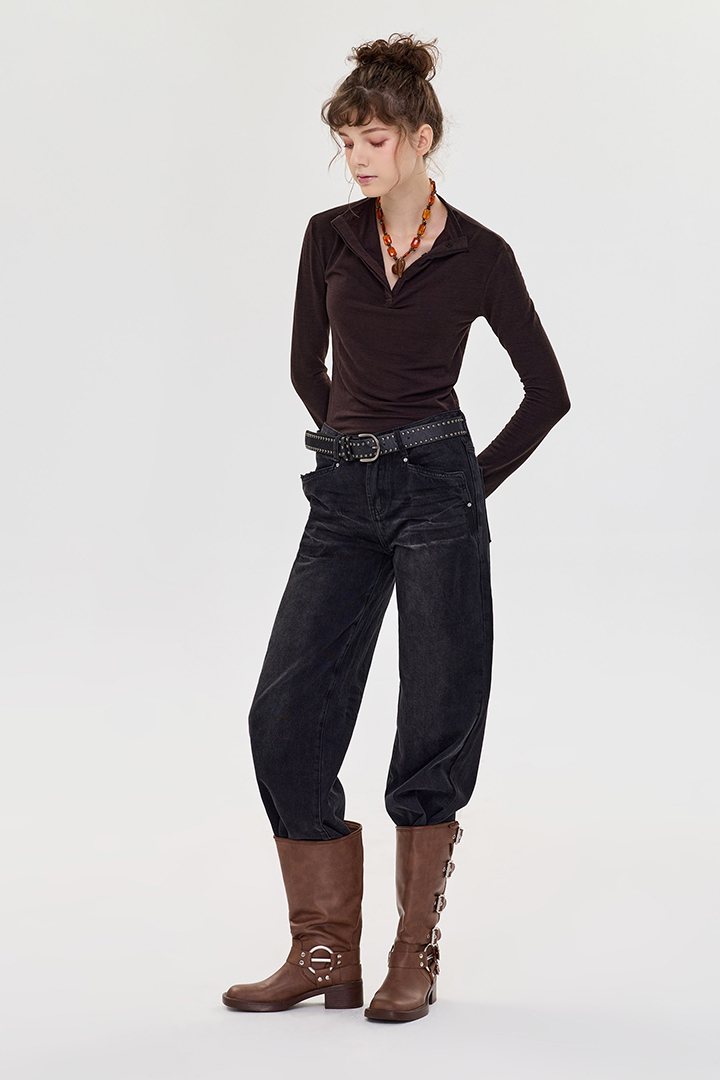 復古剪裁設計,牛仔寬褲展現潮流造型。