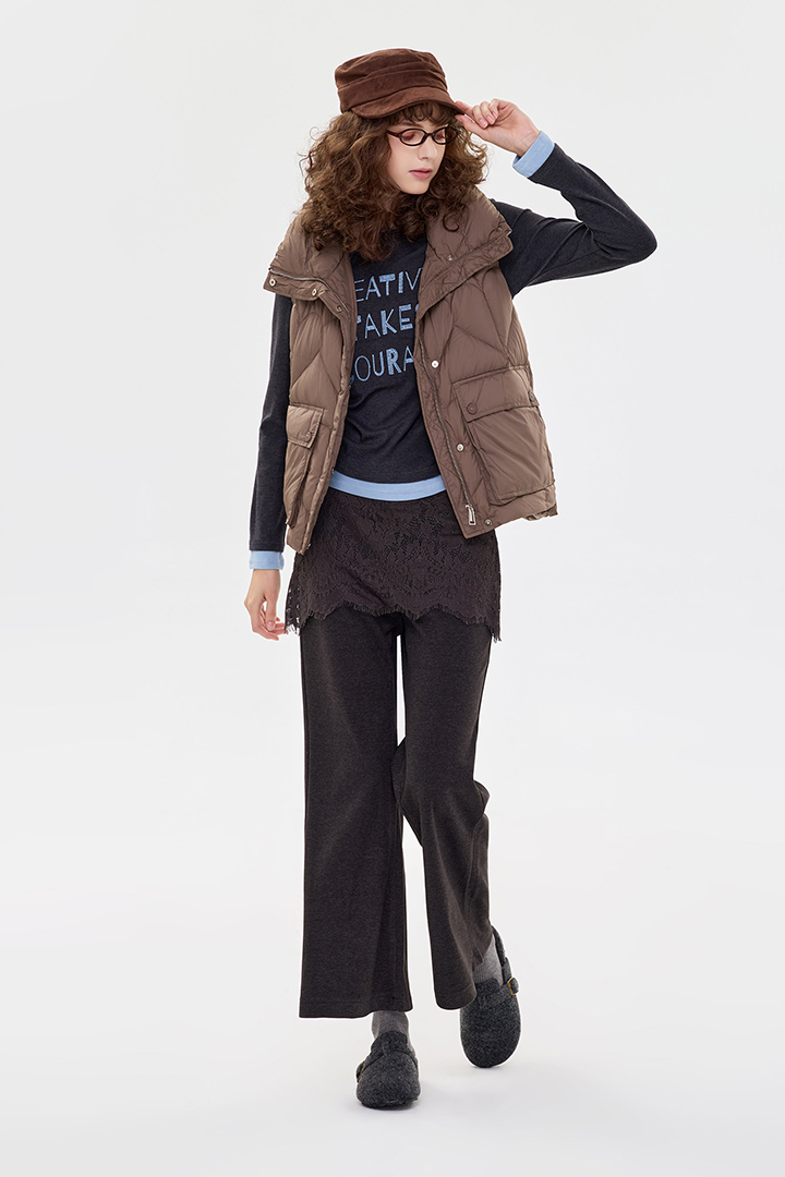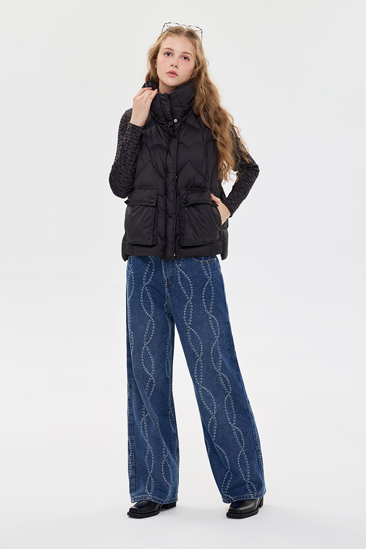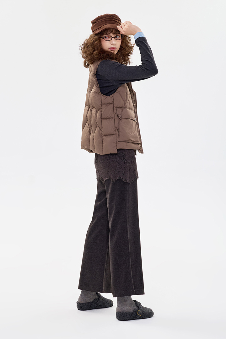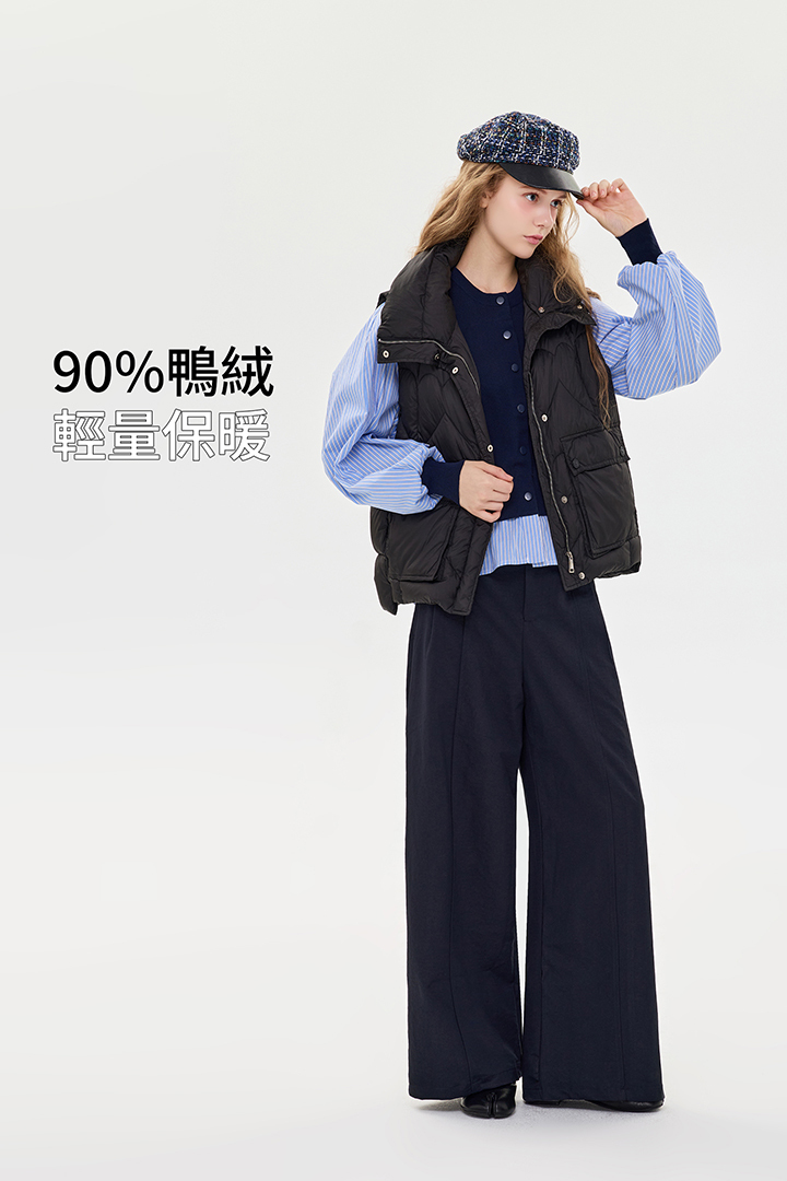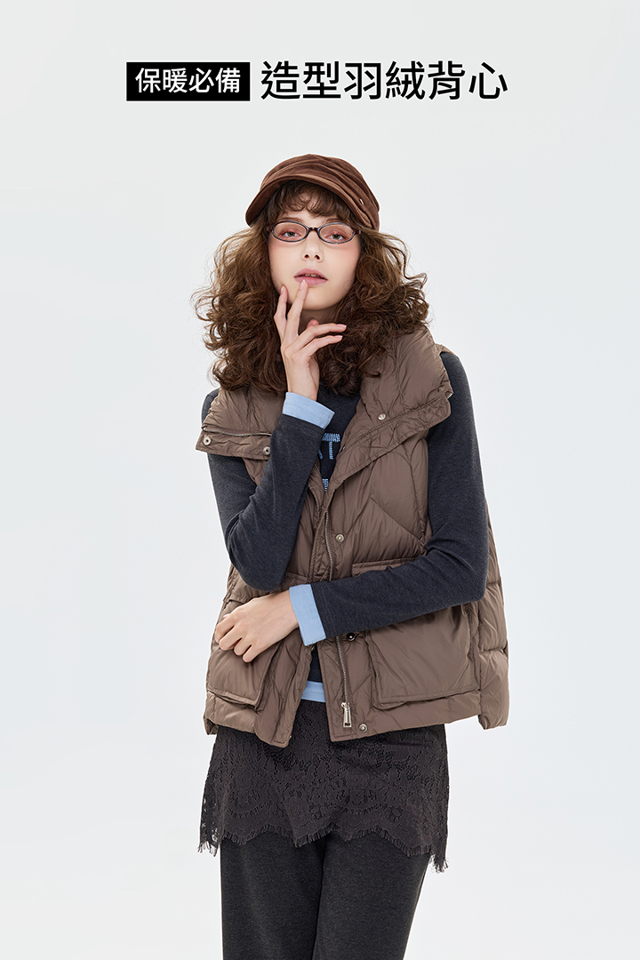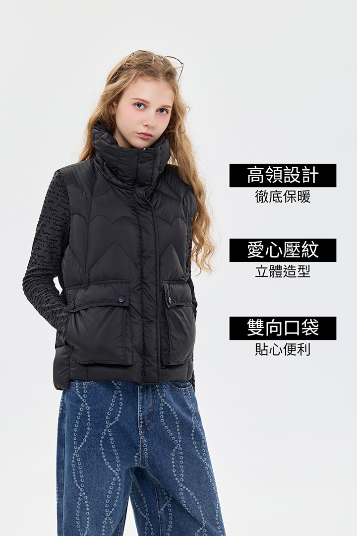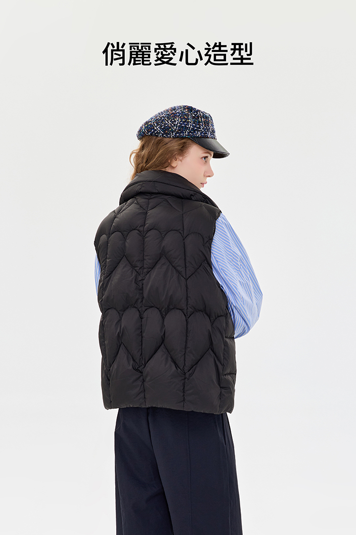 愛心格紋增特色,羽絨輕暖蓬鬆,背心版型俐落好搭配。