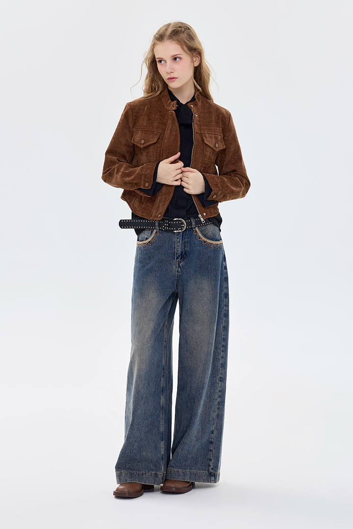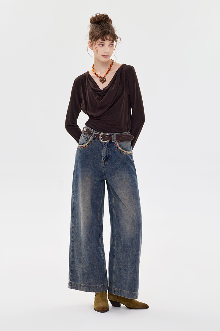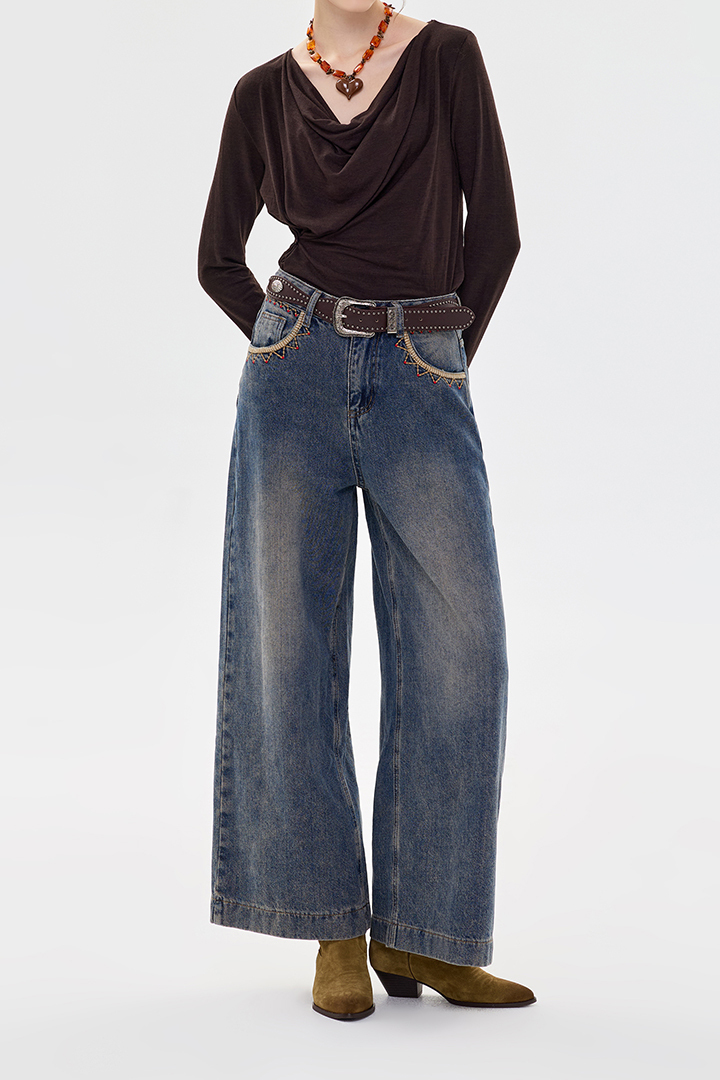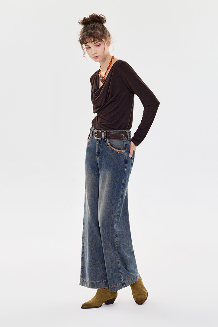 立體刺繡增添細節感,牛仔寬版剪裁俐落,修飾腿部線條。