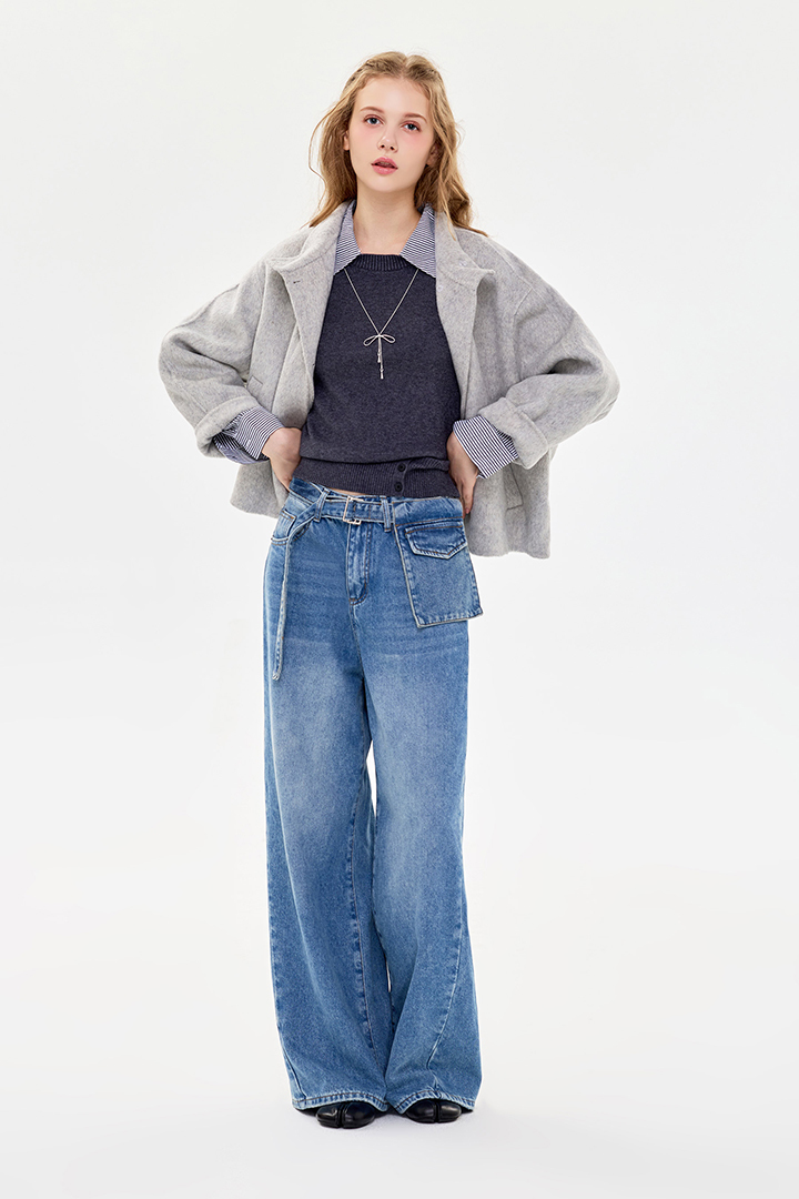 腰包造型實用增層次,牛仔布挺順耐穿,長版線條俐落有型。