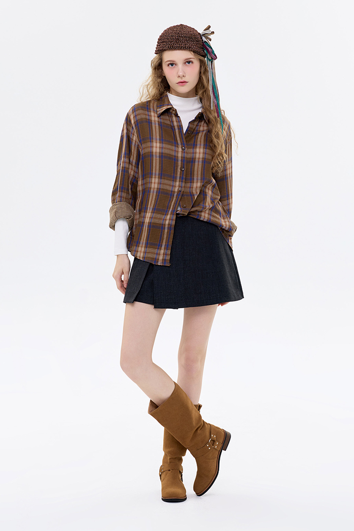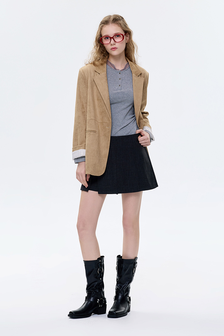 開岔小腰帶設計,毛呢短褲裙修飾腰型。