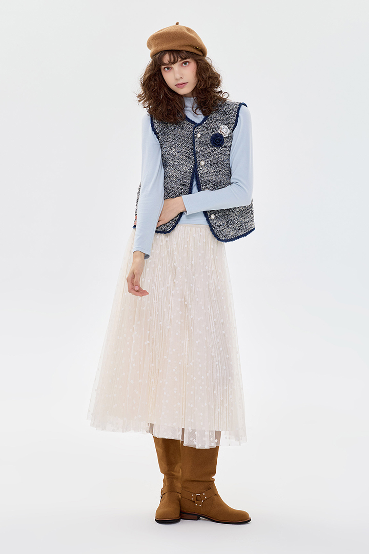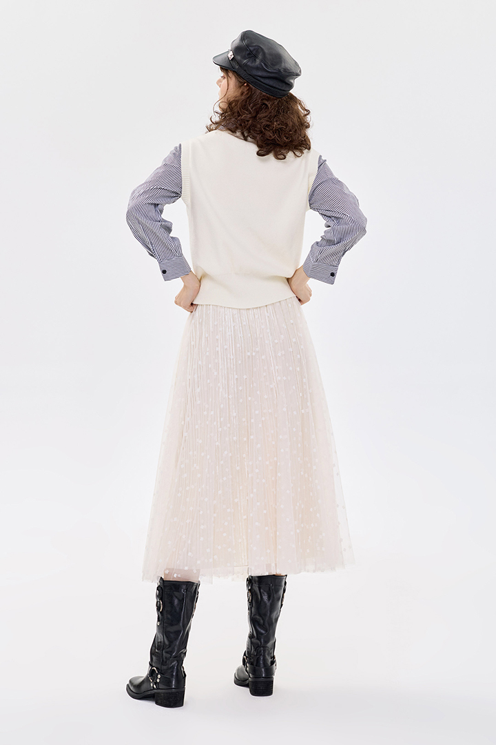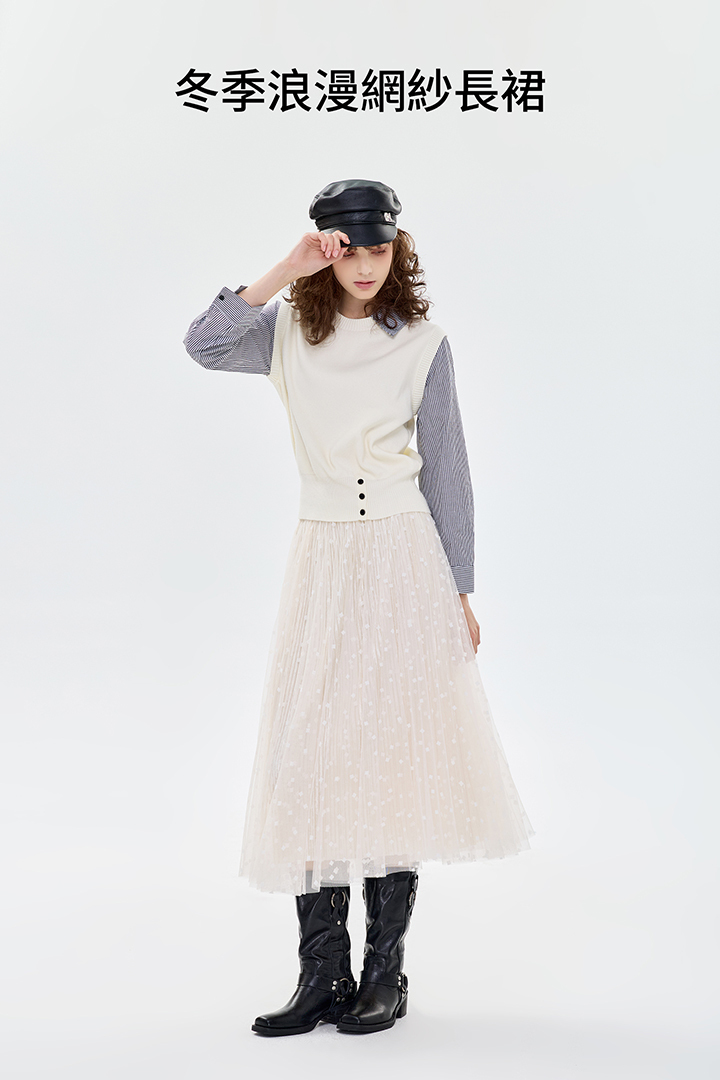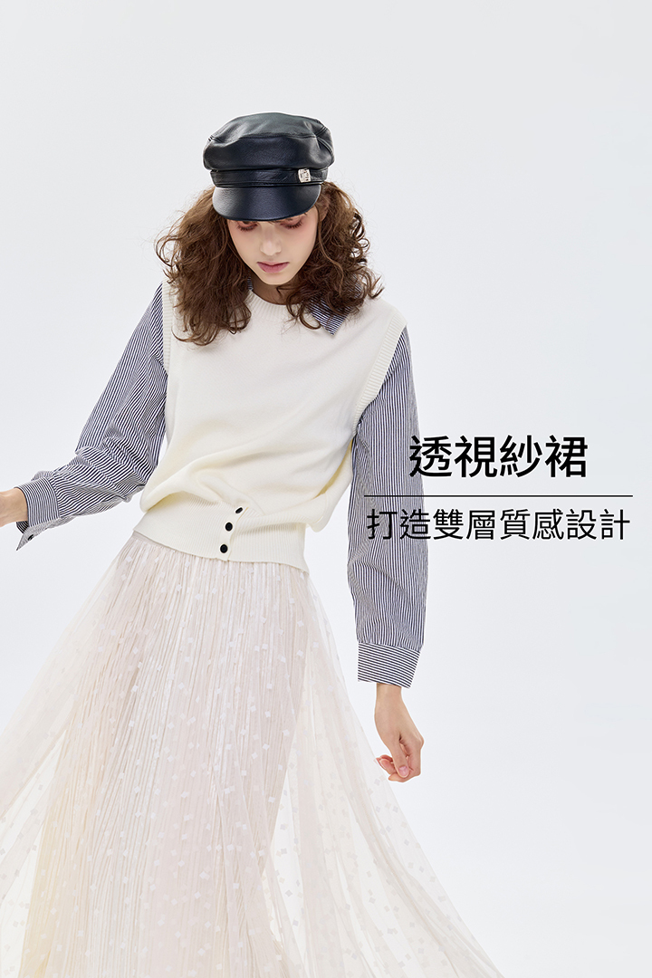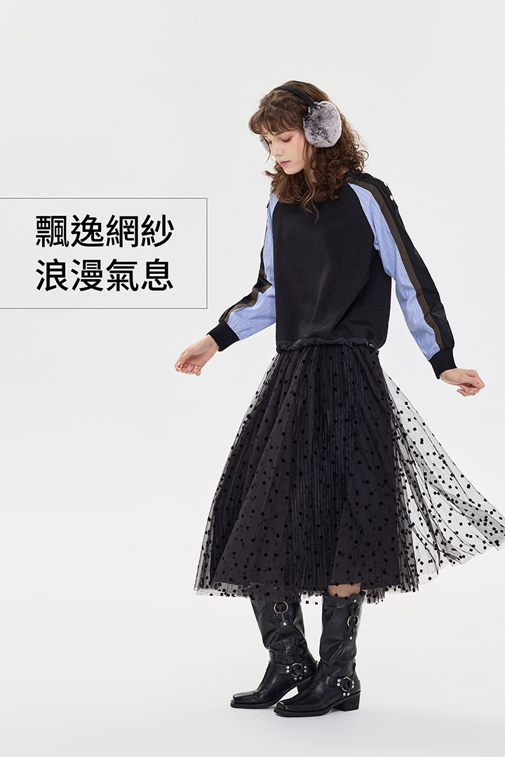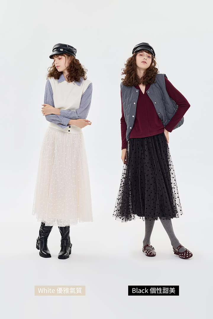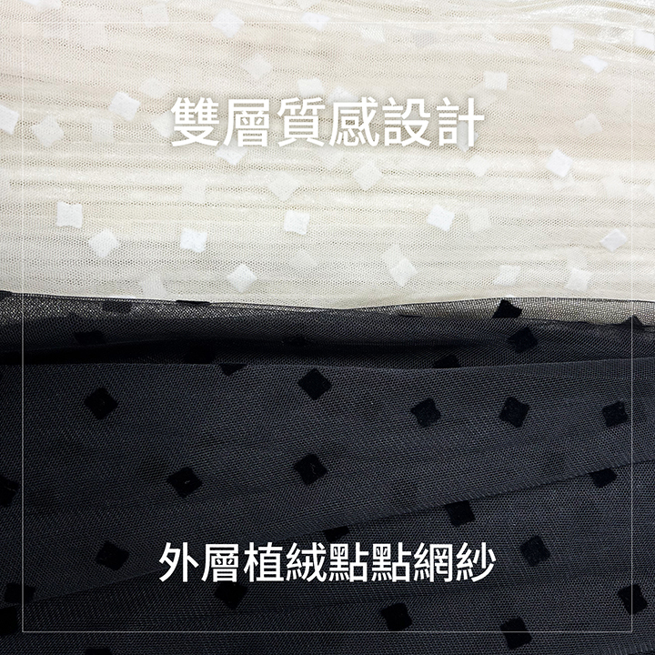 ✦外層點點植絨紗 自然散開的A字裙擺