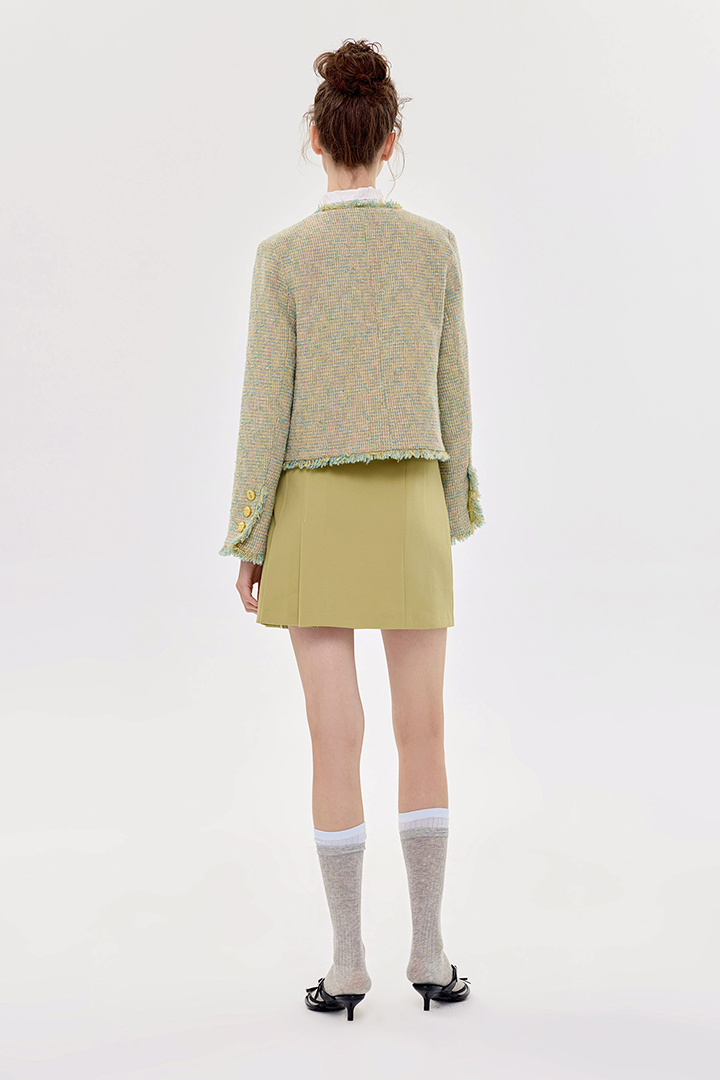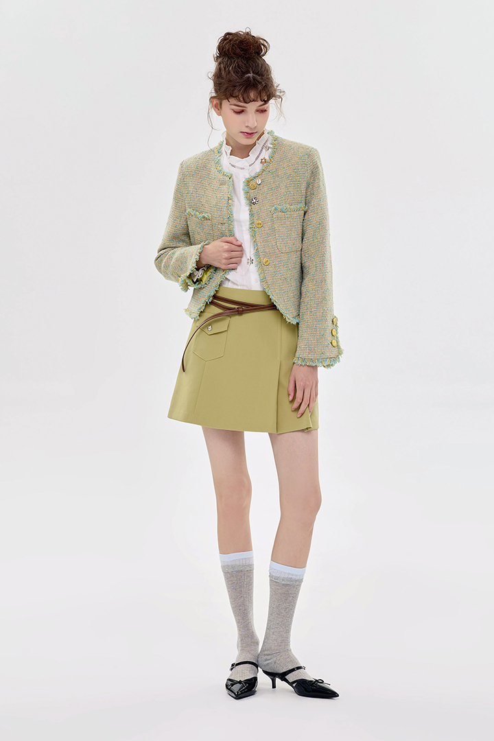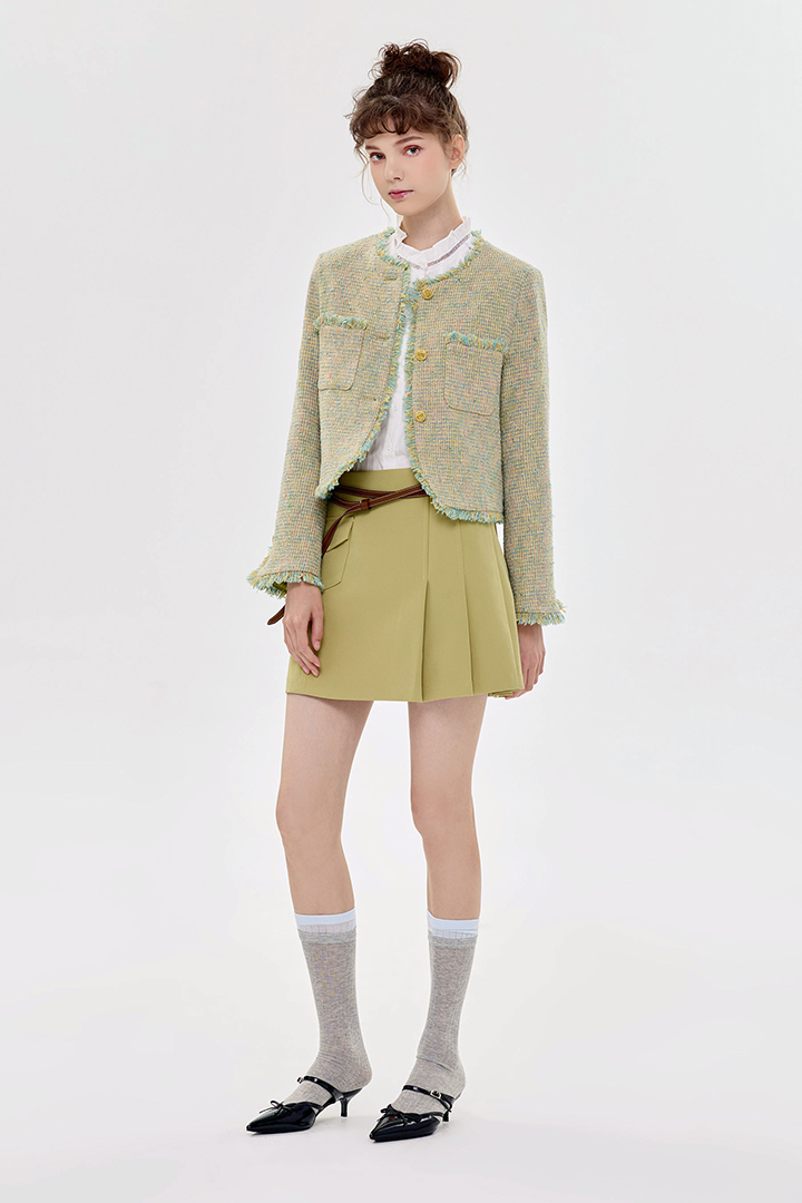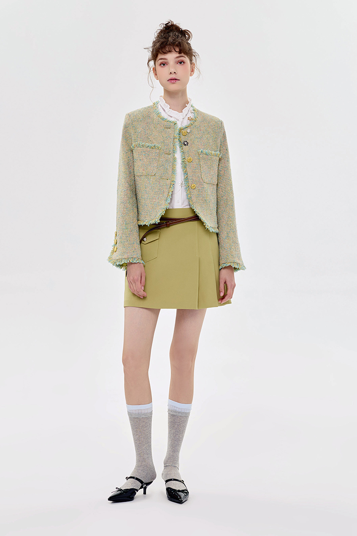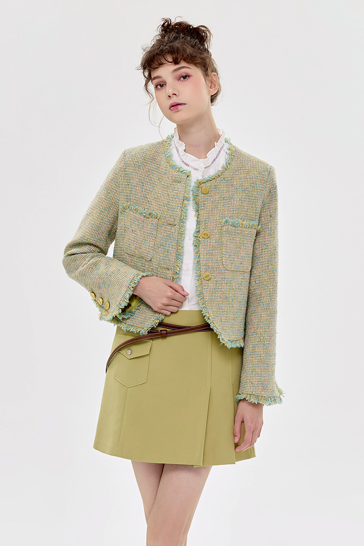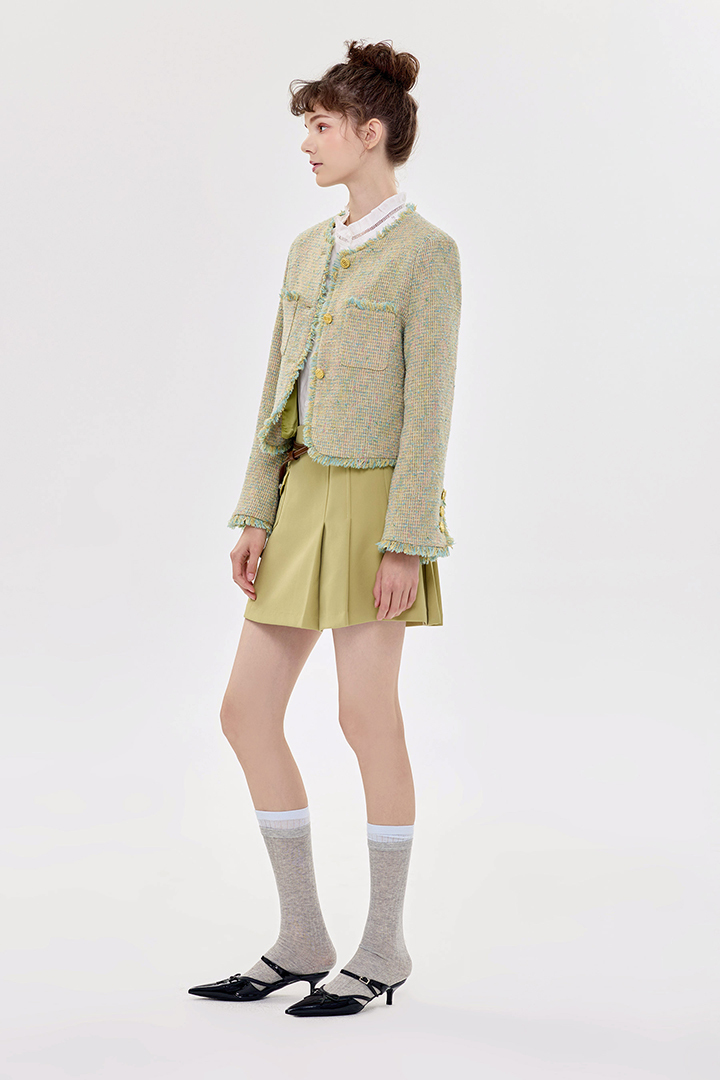 小香風花呢質感,外套剪裁精緻俐落。