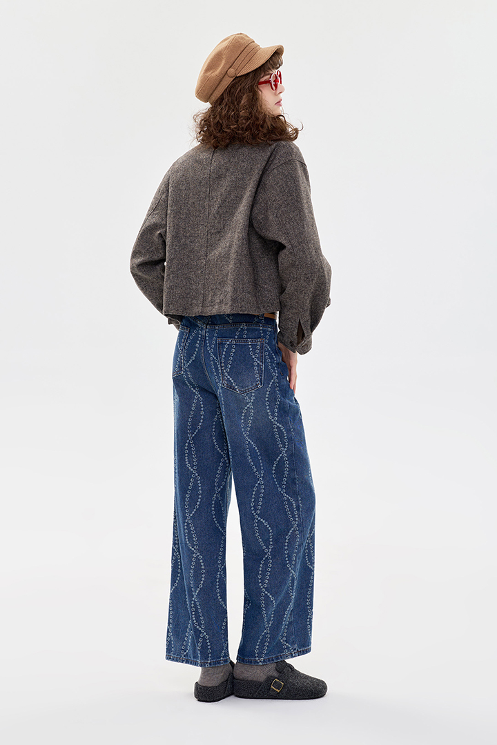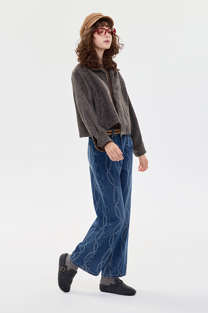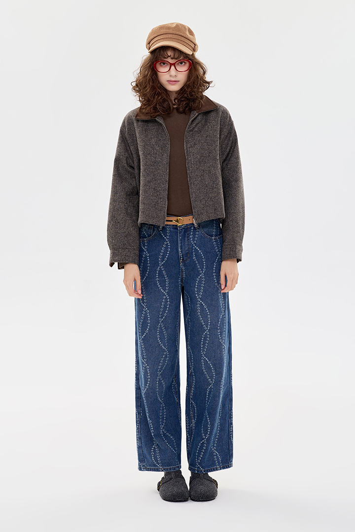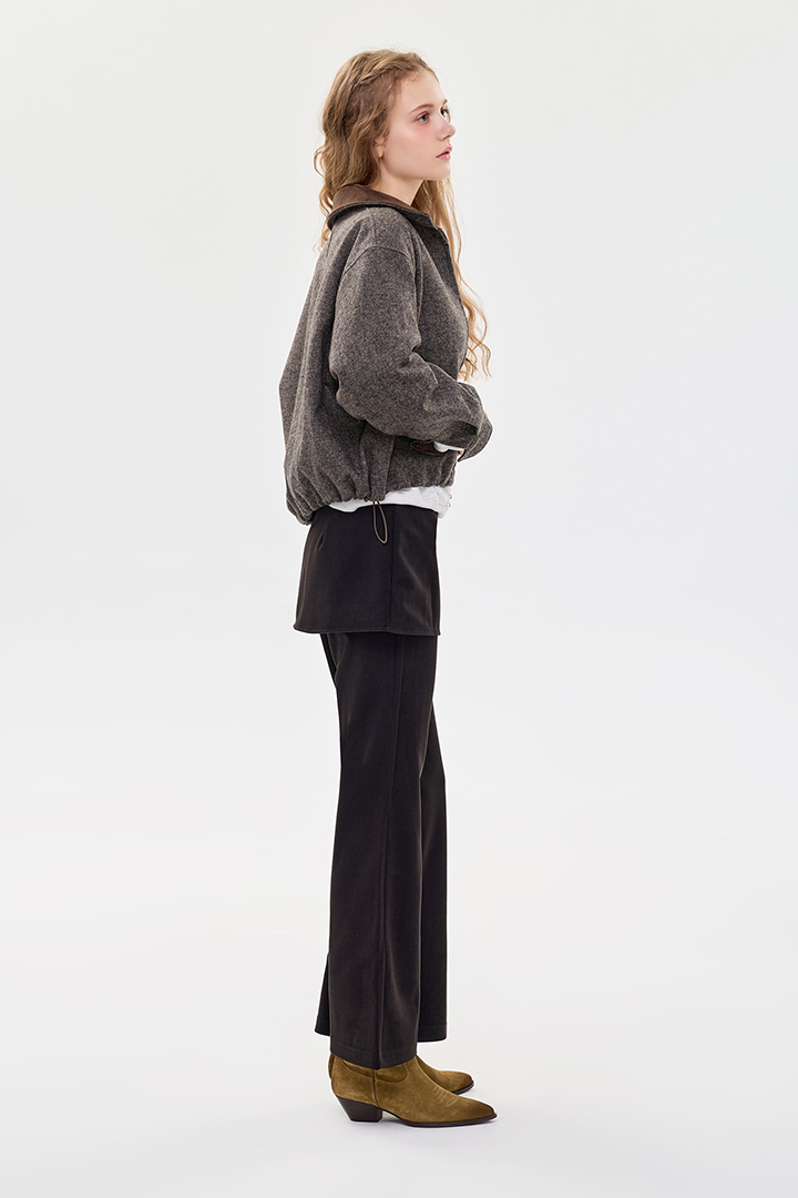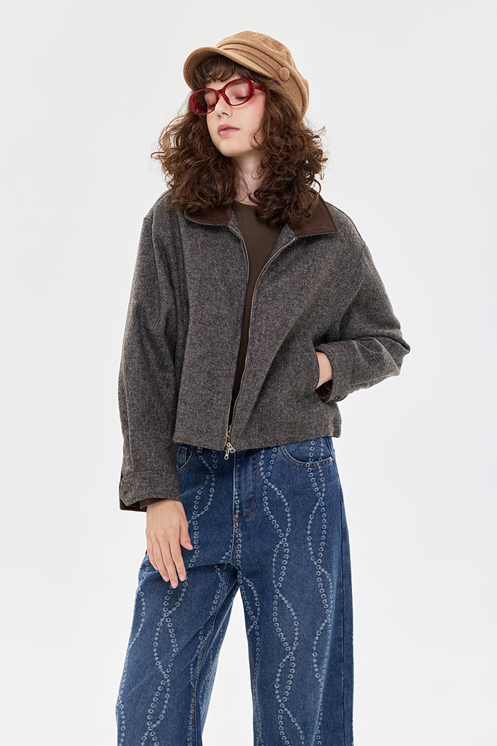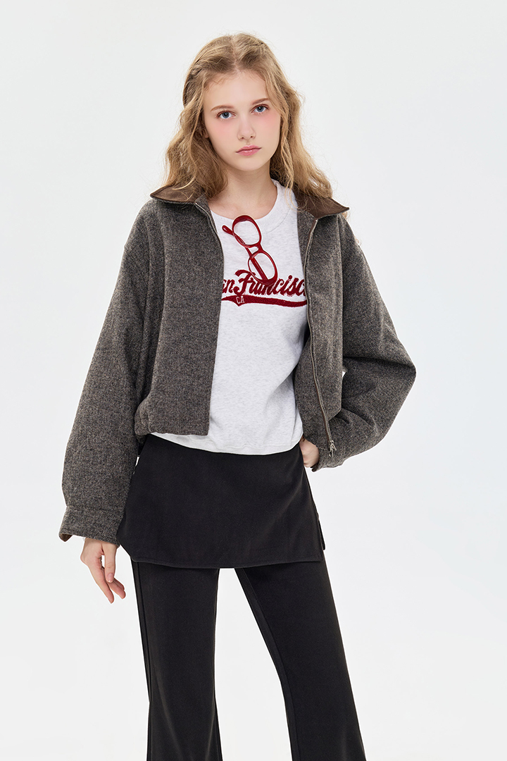 ✦ 拼接短絨皮質領設計 與衣身面料形成材質對比
